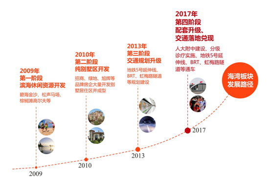 2017年,可谓是海湾发展兑现期。在经过了滨海休闲资源开发期、纯别墅区开发期、交通规划升级期,目前海湾资源配套层层落位。从休闲娱乐的碧海金沙、松声马场、棕榈滩高尔夫的落户,到5号线延伸段、BRT、虹梅南路隧道的开通,再到人大附中的建设、分级诊疗的实施,海湾进入发展快车道。