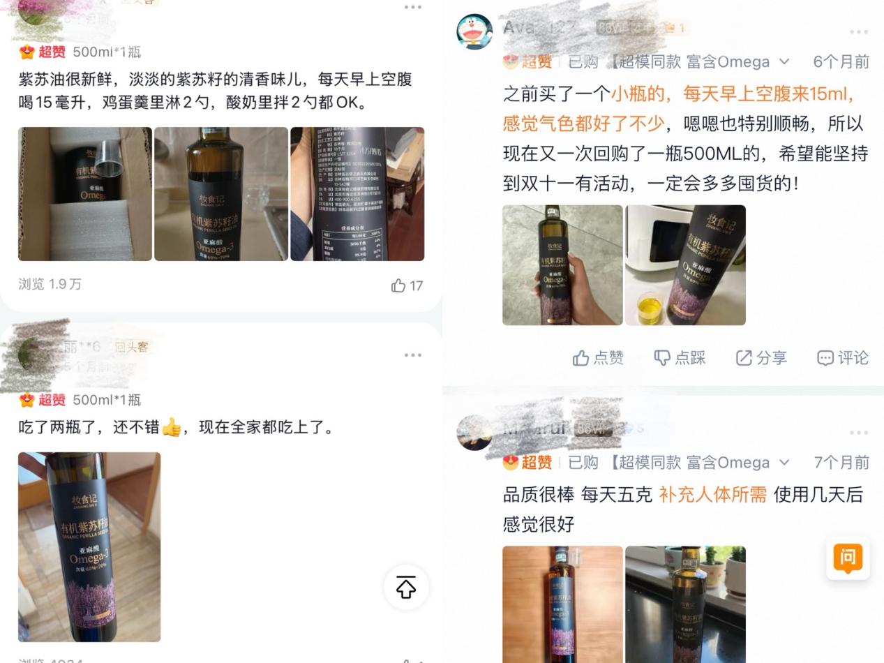 记者在几个主流电商平台搜索“妆食记紫苏籽油”发现,其销量和口碑表现都很亮眼。在商品评论区,不少消费者更是回头客,有人表示“已经是第三次回购了,家里老人孩子都爱吃,拌凉菜特别香”,也有人评价“做了很多功课才选了这个牌子,α-亚麻酸含量高,配料表干净,给孩子补充营养很放心”。还有注重内调养肤的年轻消费者分享道:“每天一小勺,直接喝也不觉得呛,坚持了一个多月,感觉皮肤状态都稳定了不少。”
