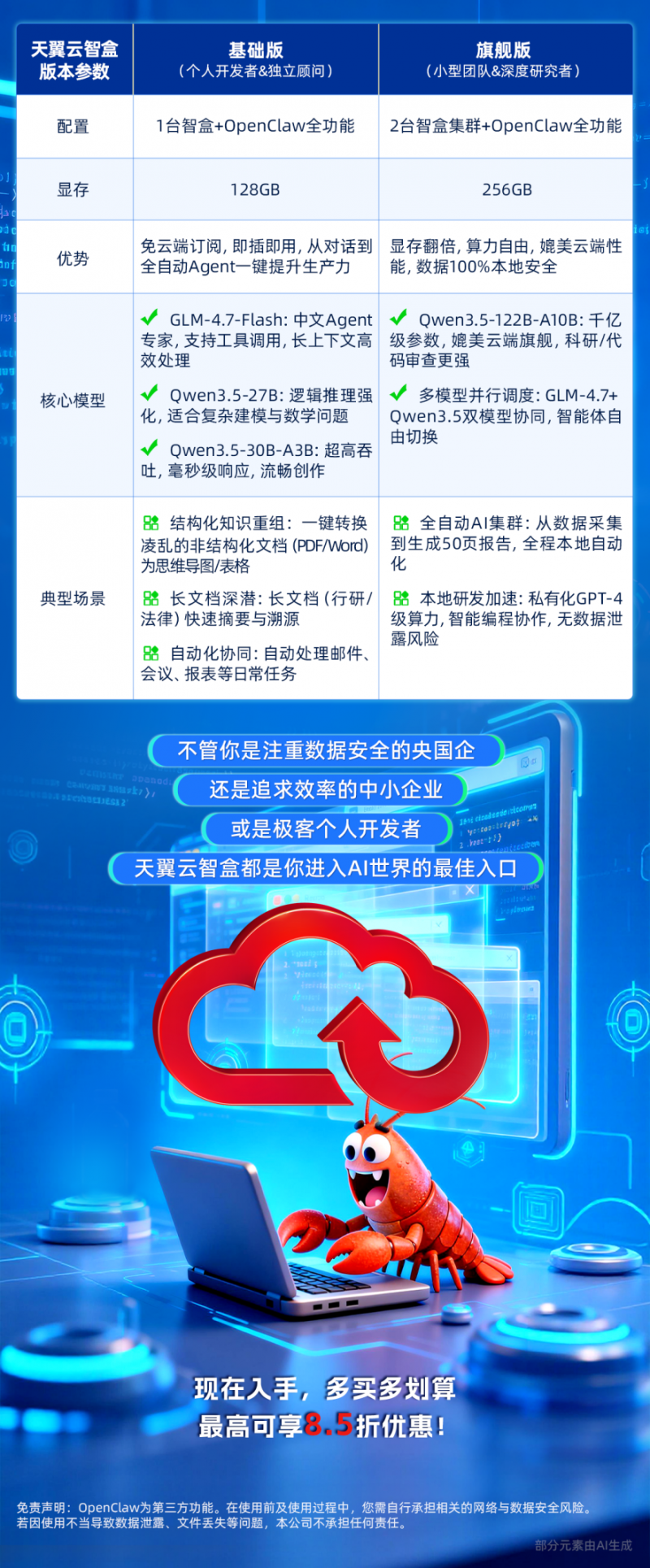 据悉,天翼云智盒龙虾版推出两大版本配置,可精准匹配不同“养虾”段位用户的需求,无论是新手开发者还是专业团队,都能找到适合自己的解决方案。此次天翼云智盒龙虾版的发布,不仅丰富了天翼云AI硬件产品矩阵,更助力OpenClaw技术的普及与落地,为AI开发者提供更高效、安全、便捷的工具支撑,推动AI推理时代的应用创新。