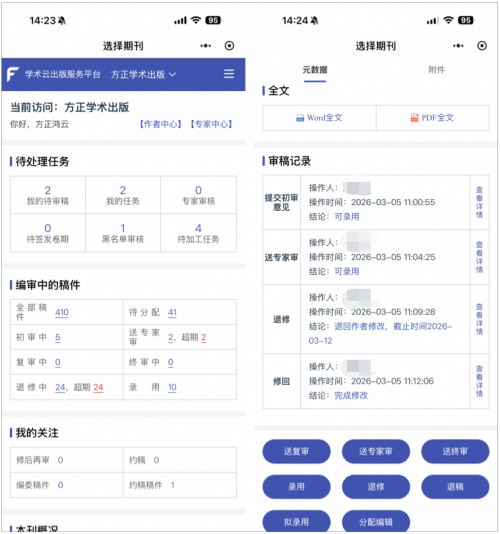 作为方正电子打造的智能化学术出版解决方案,它覆盖科研选题、稿件采集、同行评议、编校出版、多渠道传播等全流程,目前已服务1800余种合作期刊、50余个期刊集群,平台总访问量超3.5亿次,中文卓越期刊合作比例超50%。依托AI与大数据技术,方正鸿云致力于推动学术出版向集约化、智能化、国际化转型,为期刊社、编辑、作者提供高效、安全、专业的全流程服务。