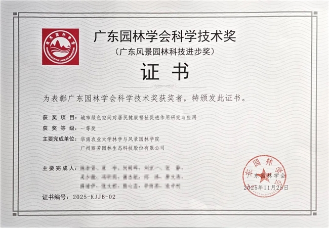 近日,广东园林学会正式公布2025年度科学技术奖获奖名单。丽芳园林凭借其在绿色空间健康效益研究与应用方面的突出创新成果,荣获一等奖。