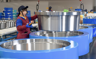 2026年3月18日,河南洛阳,洛阳豪智机械有限公司内,工人正检测风力发电机组用锁紧盘产品。图片来源:CFP