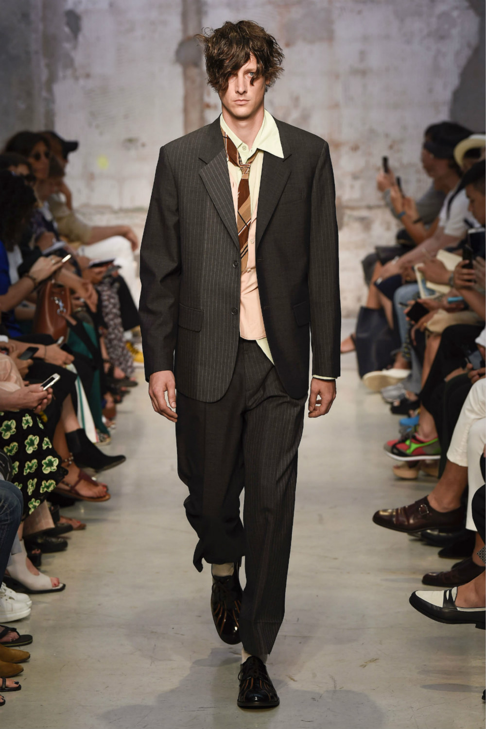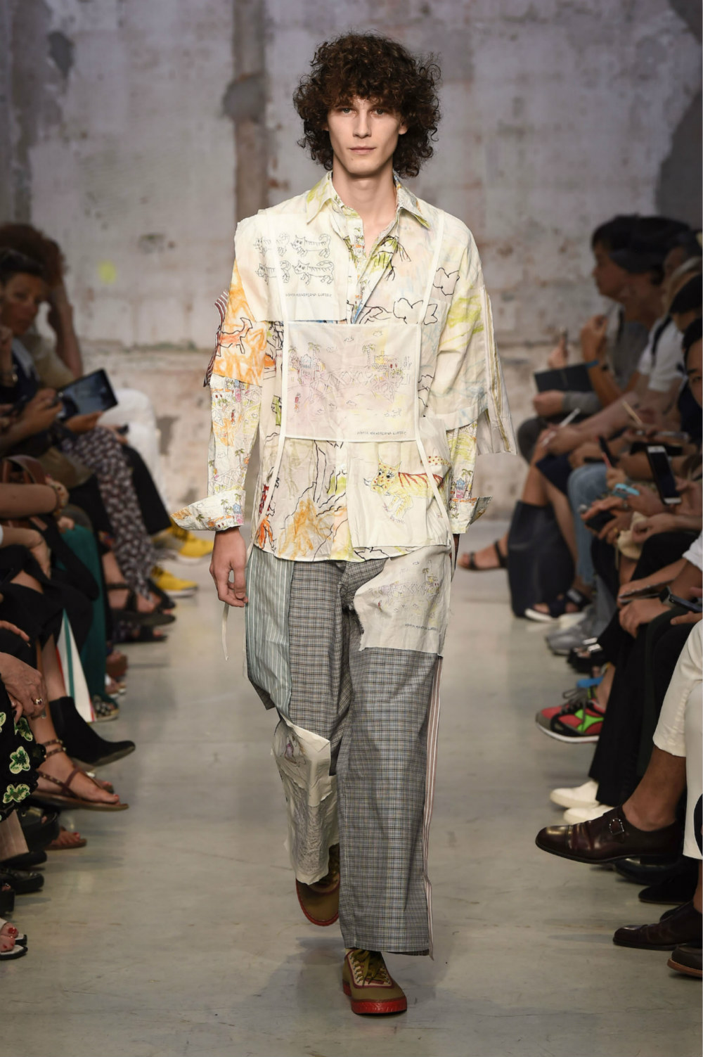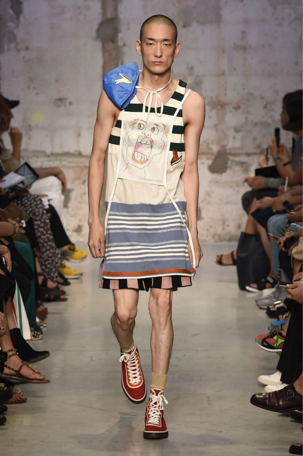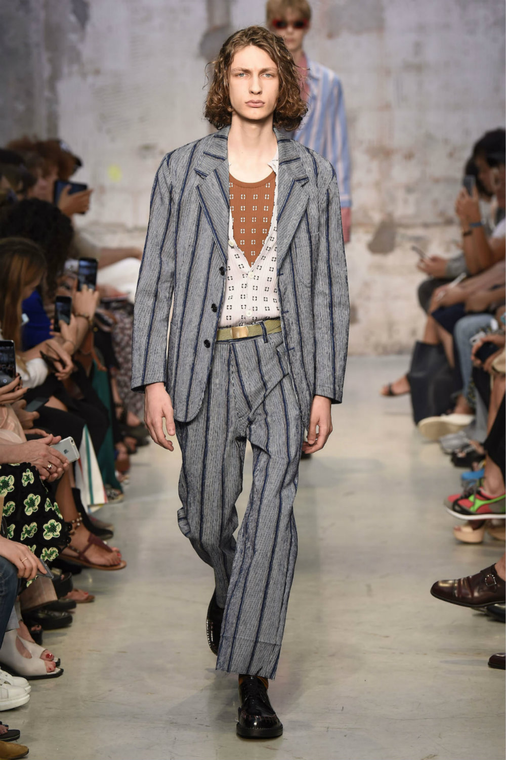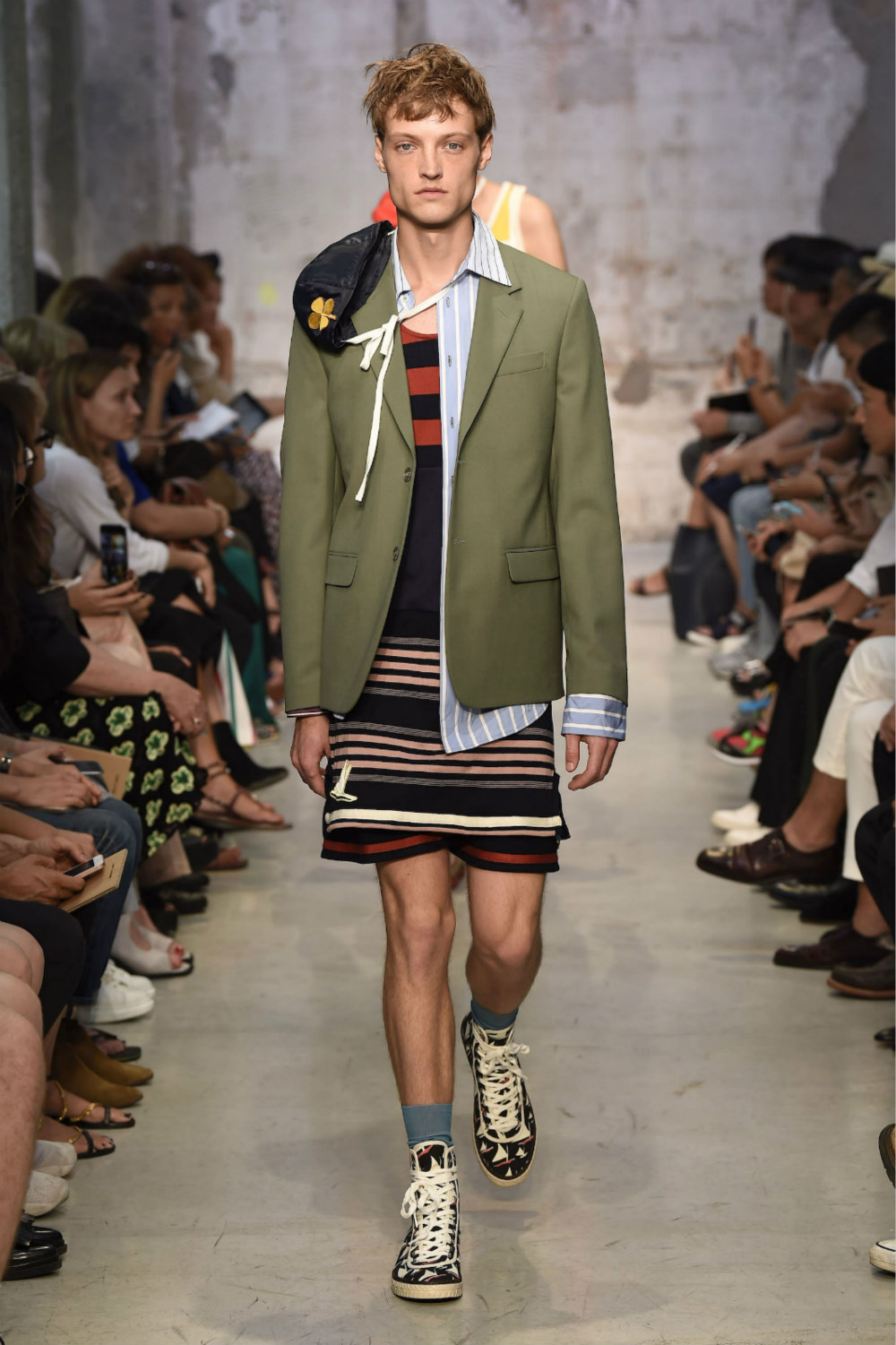 我曾经严肃地思考过一个问题,我们对衣服的评价总体来说有两种:第一种是“淑女绅士型”,剪裁合身,精致得体;第二种往往是对一些不寻常的设计,常见的词语有文艺、浪漫、先锋等——但设计师更重视哪一种评论呢,对于刚在米兰时装周发布2018春夏系列的Marni设计师来说,后一种也许更有意义。Marni一直带有浓厚的文艺气息,此次亦是由新任创意总监Francesco Risso主导的第二个男装系列,Risso并没有改动Marni的内涵,无论是图案应用和西服的掉裆设计,抑或是各种条纹的叠加拼接,都只是将将之前品牌特色的表达形式的补充。