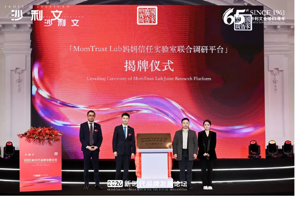 MomTrust Lab妈妈信任实验室联合调研平台在活动现场正式揭牌,沙利文中国主管合伙人兼总裁王晨晖 、沙利文中国合伙人阚狄、妈妈派联合创始人李春秋、妈妈派商务合伙人谢漪,共同出席揭牌仪式。该平台旨在依托百万级真实家庭用户群体与专业研究能力,探索构建中国家庭消费领域的信任验证新机制,为品牌提供精准的消费者洞察。