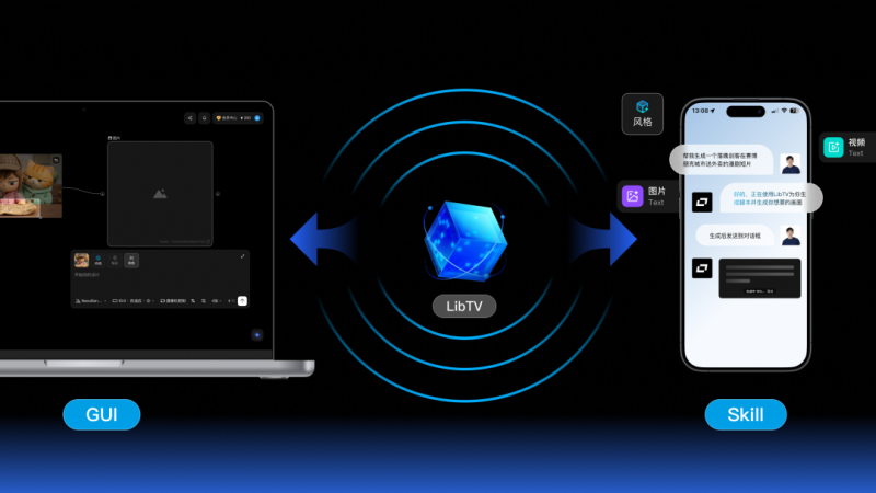 除了创作结构的调整,LibTV 另一项更受关注的变化,是其“双入口”设计。在传统图形界面之外,LibTV 同时提供面向 AI Agent 的 Skill 接口,使外部 Agent 可以直接调用其视频生成能力。通过 OpenClaw 等 Agent,用户可以以自然语言、链接或文件作为输入,由 AI 自动完成从脚本生成、分镜设计到视频输出的全过程。