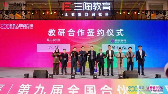 大会迎来极具里程碑意义的战略发布环节。三陶教育创始人、董事长张锦超与合肥皖智教育集团董事长徐坤共同登台,正式签署教研合作签约仪式。徐坤表示,双方将围绕教研本地化,助力三陶合伙人实现全新发展突破。