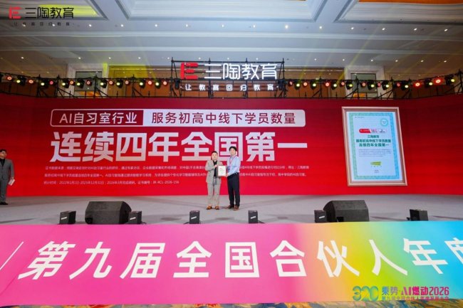 活动现场,艾瑞咨询消费事业部研究总监赵楠为三陶教育授予“AI自习室行业服务初高中线下学员数量连续四年全国第一”市场证明。三陶教育正以坚实步伐,书写行业高质量发展的崭新篇章。
