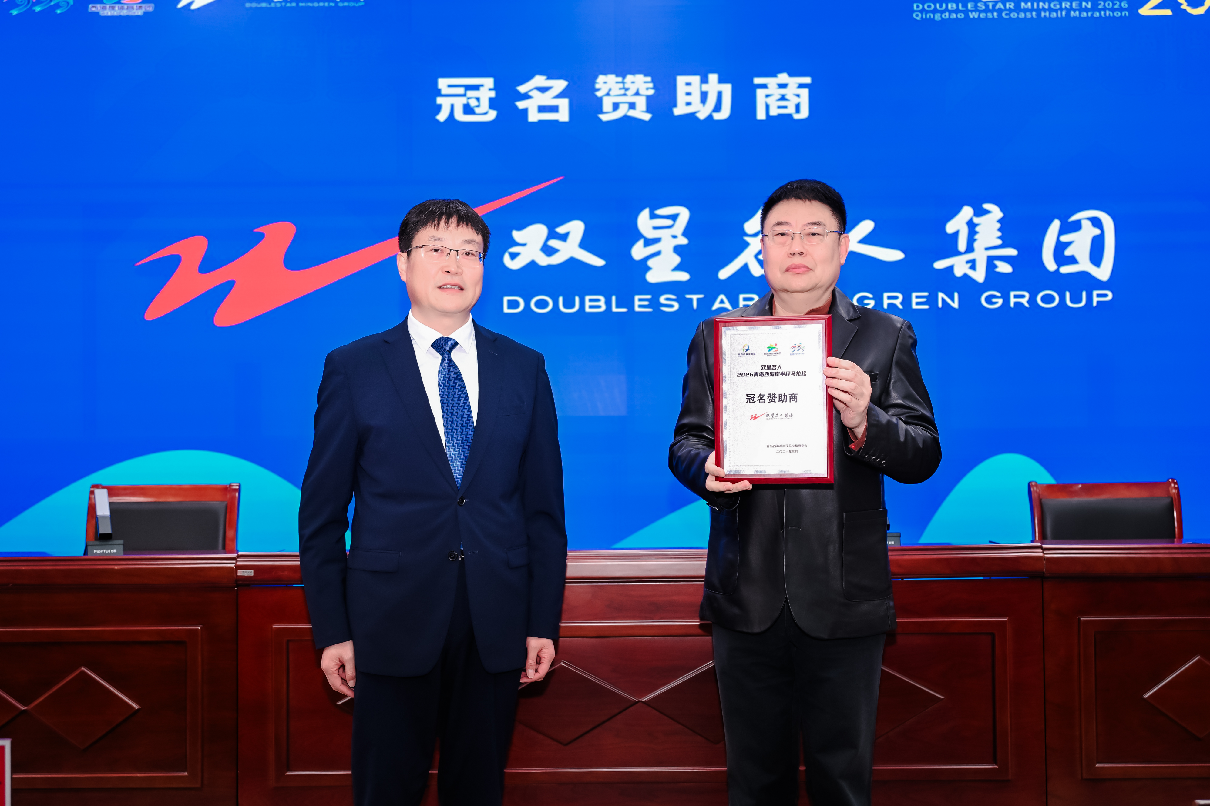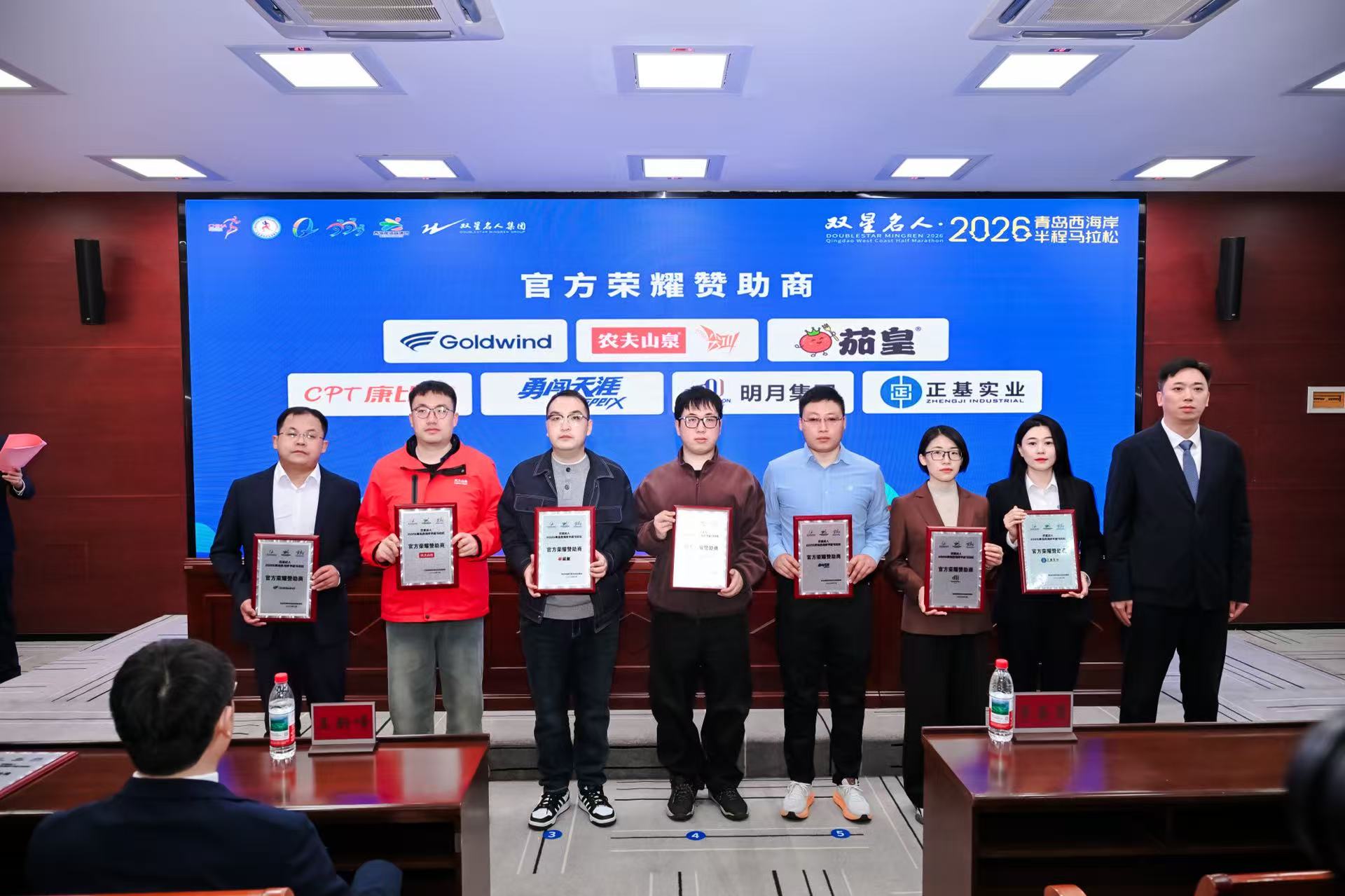 会上介绍了本届赛事整体概况和赛事筹备情况,并现场发布赛事奖牌与参赛服。随后向冠名赞助商双星名人集团,官方荣耀赞助商金风科技、农夫山泉、统一、康比特、华润雪花啤酒、明月集团、正基实业颁发合作牌匾。