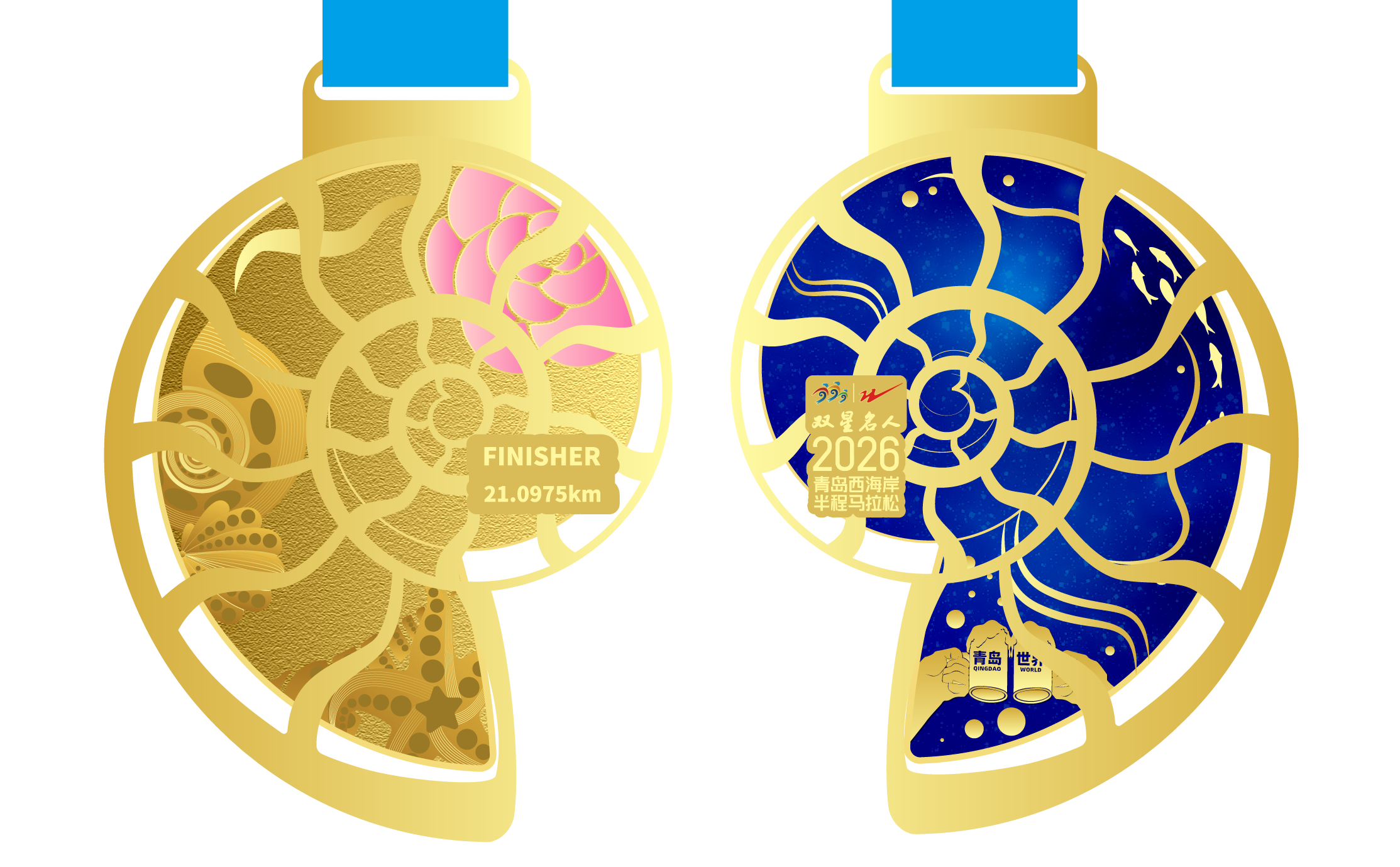 延续“把青岛带回家”特色奖牌设计。以西海岸新区海螺为核心造型,巧妙融入浪花、“青岛·世界”标识及山茶花元素,既呼应西海岸新区的海洋基因,又点缀出城市的浪漫氛围。奖牌不仅致敬了八届赛事的历史底蕴,更以“螺旋向上”的意象礼赞跑者挑战自我、永不止步的奔跑精神,打造兼具纪念意义与收藏价值的专属信物。