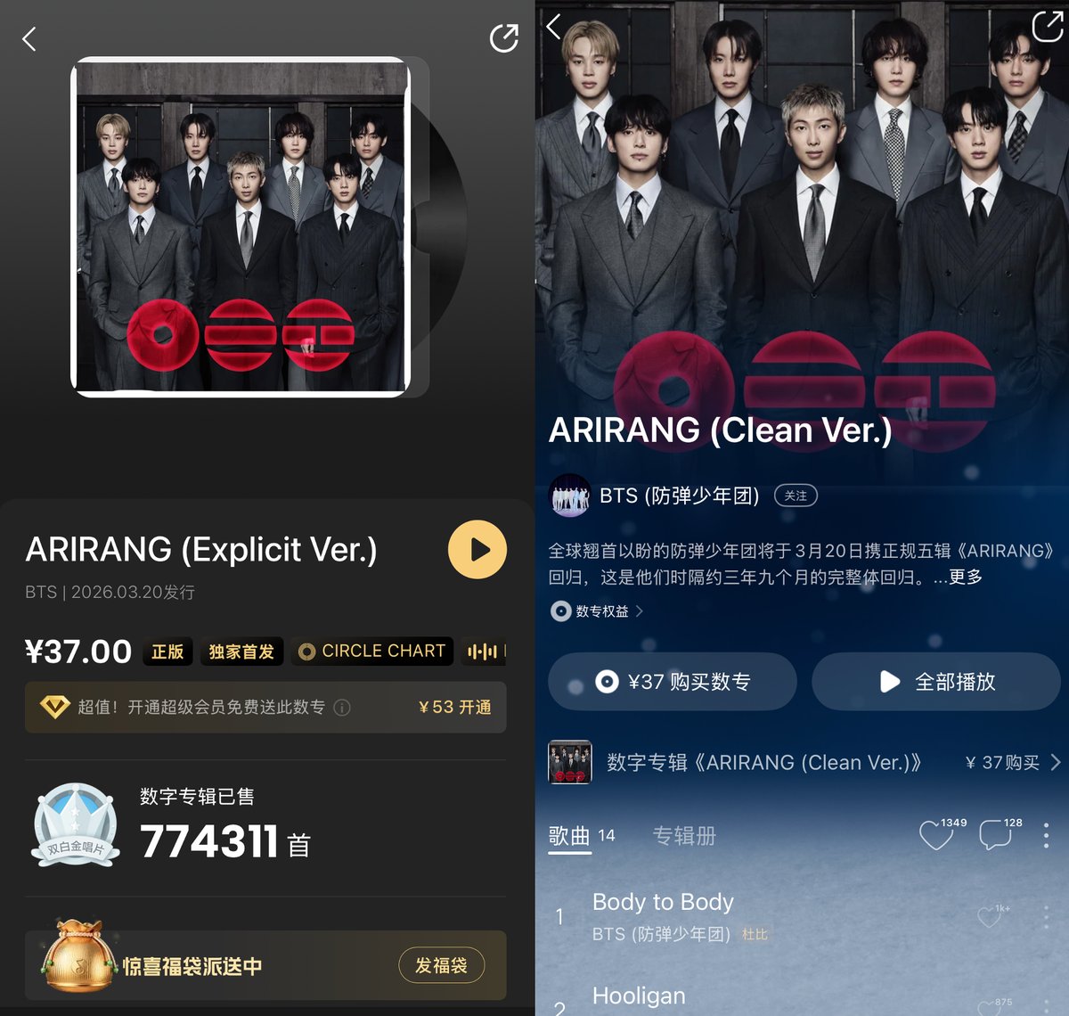 3月20日,顶级男团BTS(防弹少年团)数字专辑《ARIRANG》在QQ音乐、酷狗音乐、酷我音乐独家首发上线,用户可以通过购买新专辑解锁独家福利,同时该专辑也将陆续举行相关痛楼活动。全球翘首以盼的BTS携正规五辑《ARIRANG》回归,这是他们时隔约三年九个月的完整体回归。成员们将过往旅程中沉淀的真诚经历与思考,巧妙融入14首歌曲中,展现出“当下防弹少年团”的面貌。专辑中包含了对与粉丝分开这些年的思念和等待,展现了BTS对音乐和粉丝的持续承诺。