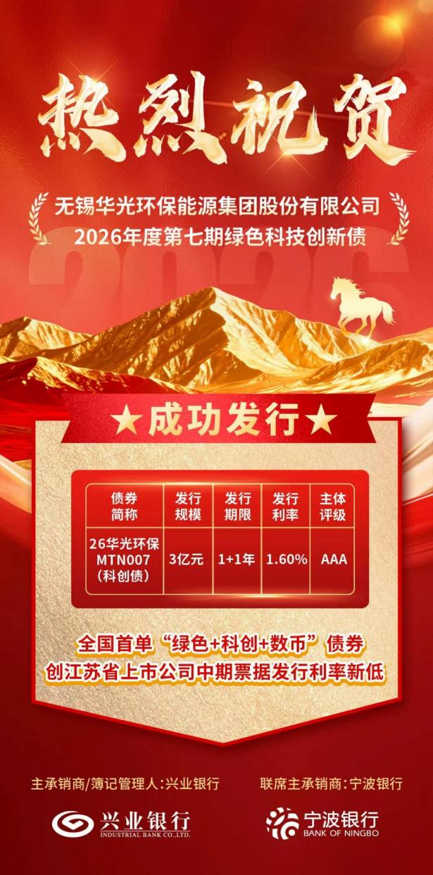 3月10日,由兴业银行南京分行牵头主承销的无锡华光环保能源集团股份有限公司2026年度第七期绿色科技创新债成功发行,发行规模3亿元,期限1+1年,为全国首单“绿色+科创+数币”债券。