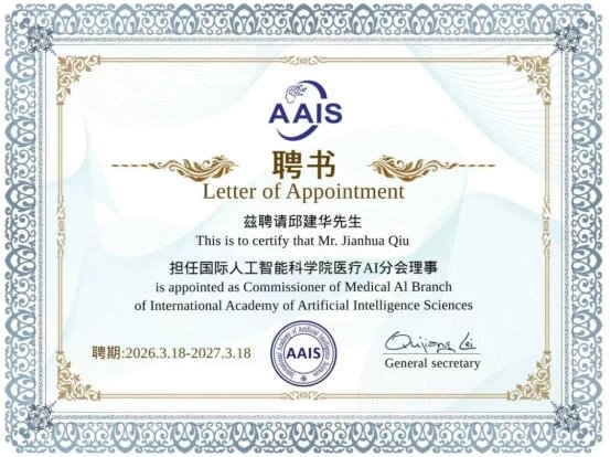 近日,智慧眼董事长邱建华当选国际人工智能科学院(International Academy of Artificial Intelligence Sciences, AAIS)医疗AI委员会理事。该任命体现了国际学术组织对邱建华专业能力与行业影响力的高度认可,也标志着智慧眼在医疗AI 赛道的技术创新、产业落地与行业价值,获得全球顶尖学术平台的权威肯定。