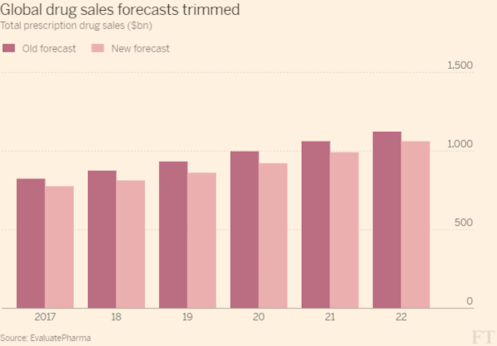 据英国《金融时报》消息,医药市场研究机构EvaluatePharma6月20日宣布下调全球制药公司的收入预期,将未来五年(2017-2022年)全球药企的收入预期下调3900亿。