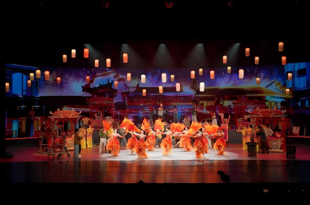 而开场节目《融·耀》则将整个舞台变作一个“活”起来的非遗市集。舞龙的汉子、凤阳花鼓的鼓点、糖画摊前的孩子……70余位演员共同绘就一幅江淮民俗风情卷 。这种对生活场景的复刻,让非遗重新获得了呼吸。它不是需要被“保护”的易碎品,而是我们生活里触手可及的温暖。