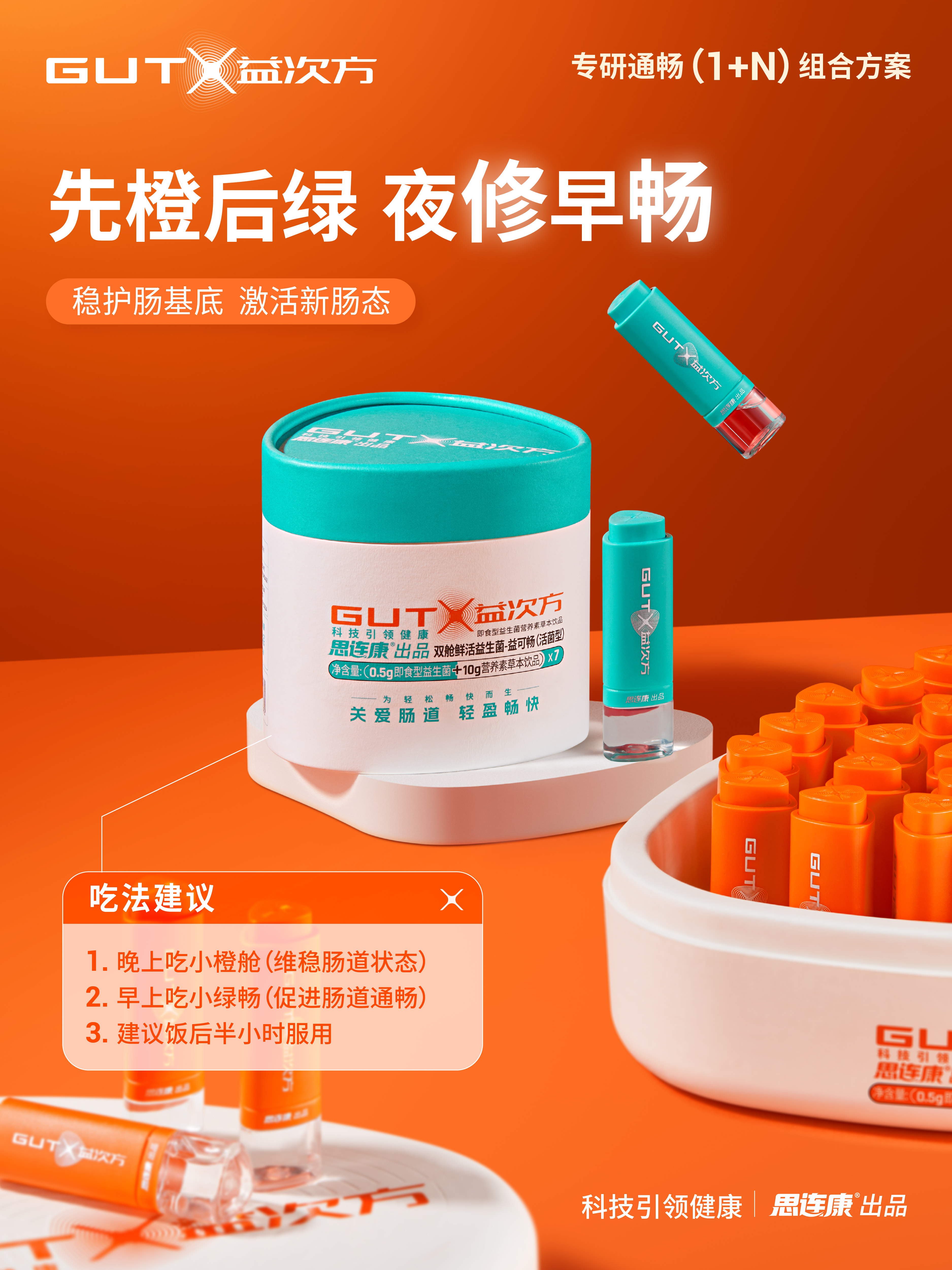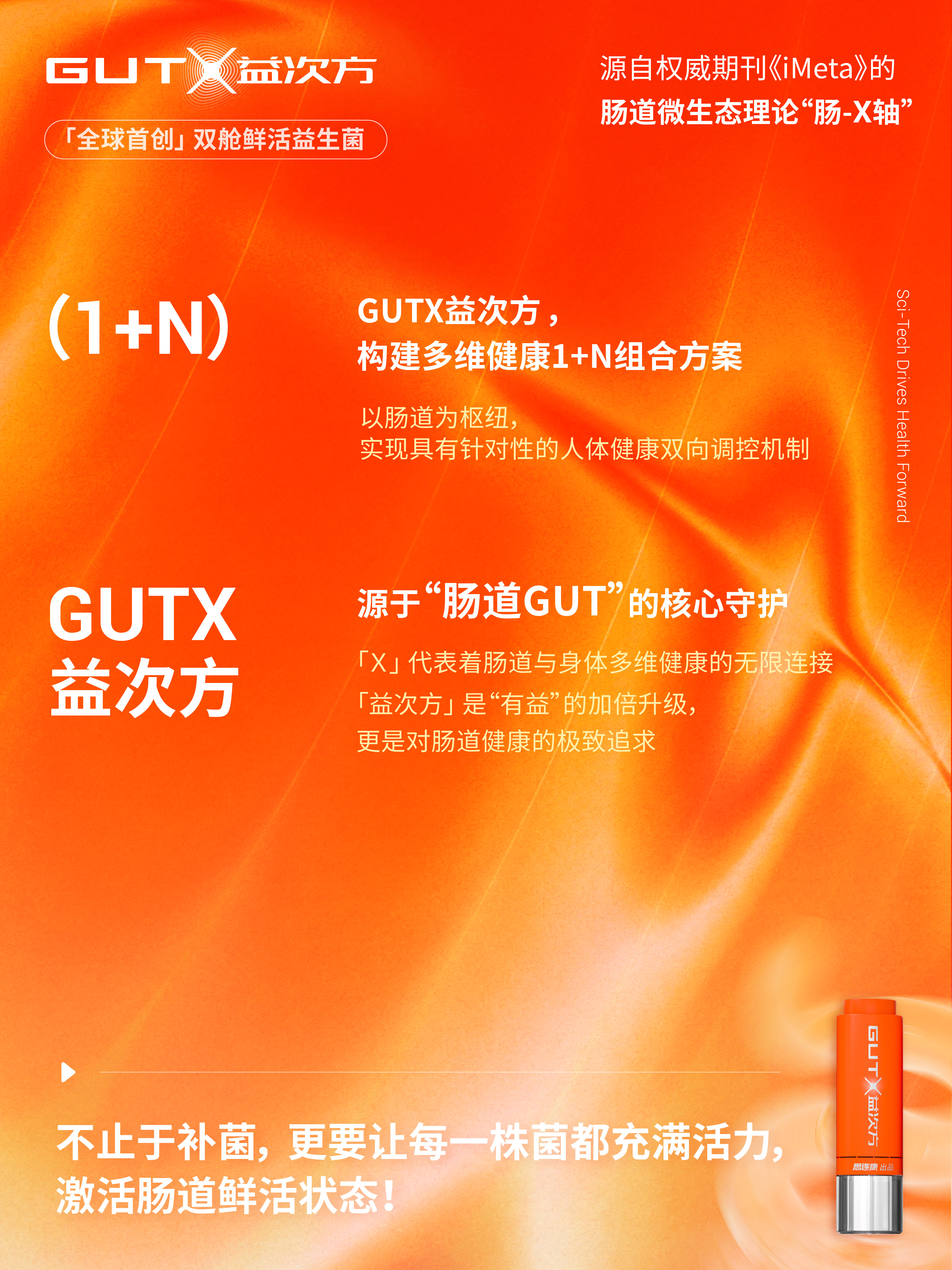 正是基于这种开创性的技术,GUTX益次方得以创新性地提出以肠道为枢纽,并结合N种针对性健康需求的“1+N”组合方案,旨在通过产品组合,实现对人体健康更全面的双向调控。