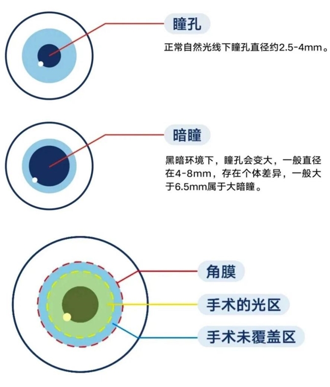 但为什么很多人术前不觉得,术后意识到了,或者术前比较轻微,术后加重了呢?这就要提到另一个概念:光学区,我们可以理解成照相机的镜头最优质的核心区,它是近视手术的治疗范围。如果瞳孔放大后的尺寸,超过了角膜上能提供完美聚焦的有效光学区,那么边缘部分的光线无法准确聚焦到视网膜上,这些失焦的杂散光就会形成干扰,也就是眩光。