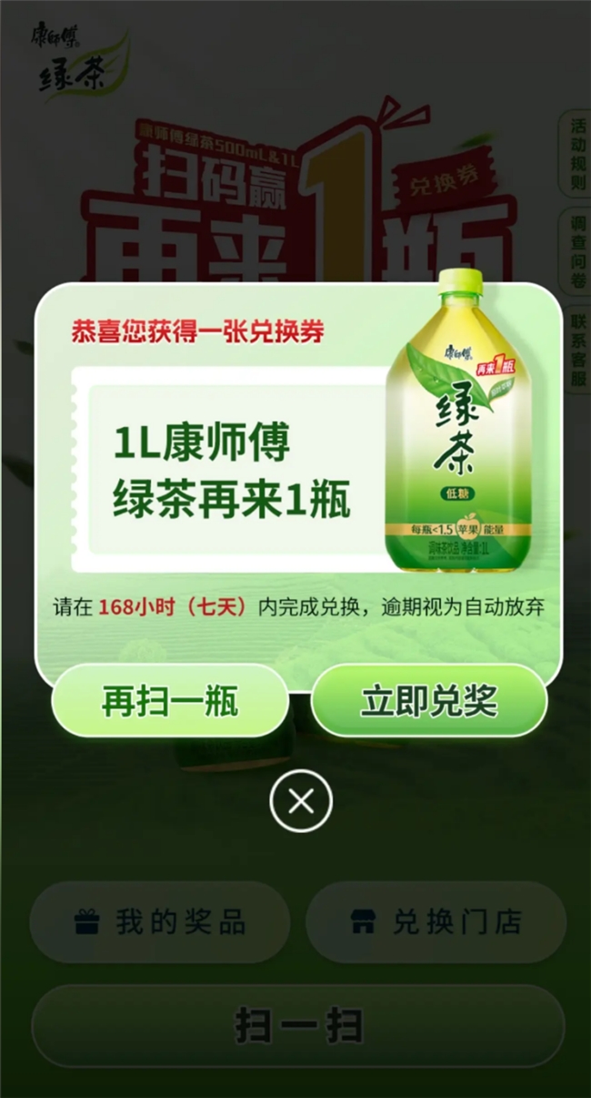 同时,康师傅再来一瓶中奖券有效期的设计,促使消费者为核销中奖券,会主动再次到店,这一过程中不仅完成兑奖,更大概率产生额外消费,有效提升门店复购率,让生意更持久、更稳定。