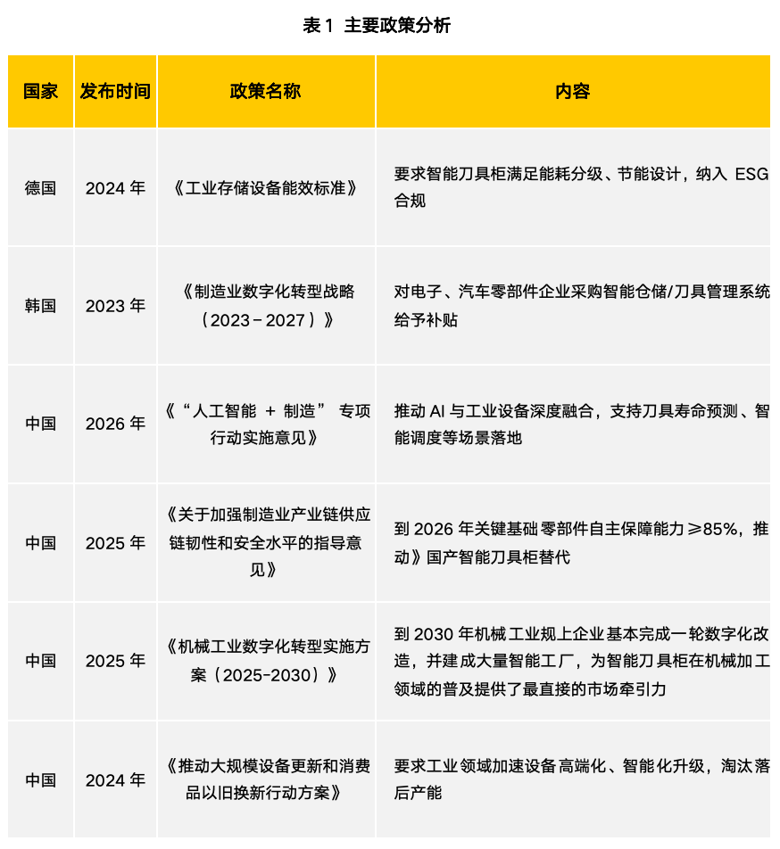 作为全球制造第一大国,中国拥有覆盖汽车、电子、机械加工的全产业链生态,孕育了全球规模最大的刀具消费市场。当前,制造业正处于从 “规模化” 向 “智能化” 跃迁的关键周期,头部企业及腰部厂商对刀具管理数字化的内生需求显著升级。政策层面,国家智能制造战略的持续赋能降低了设备落地门槛;产业层面,本土供应商凭借高性价比与敏捷本地化服务,有效击穿中小厂商的采购决策链条,这些因素共同驱动智能刀具柜渗透率加速上行,形成全球增长的核心增量来源。