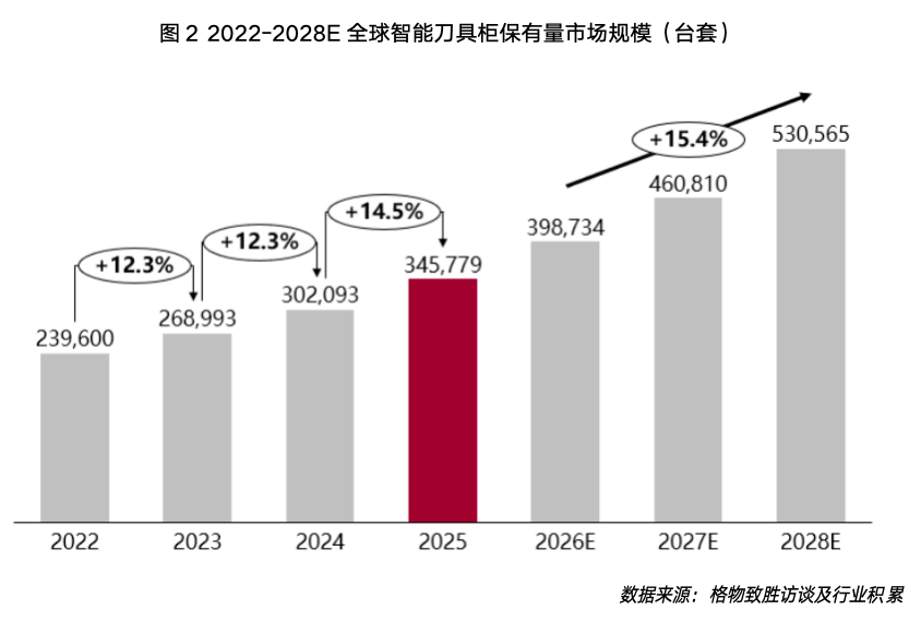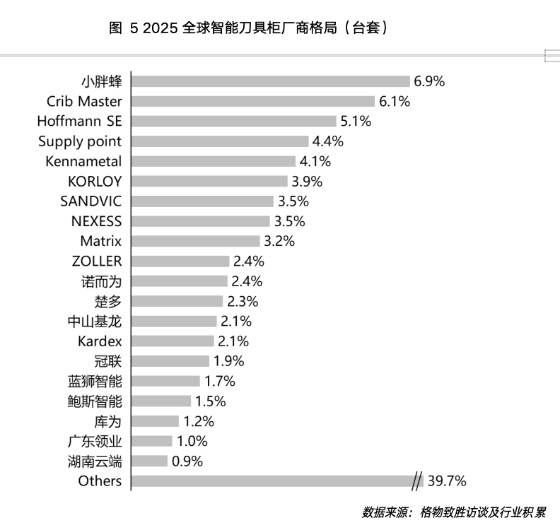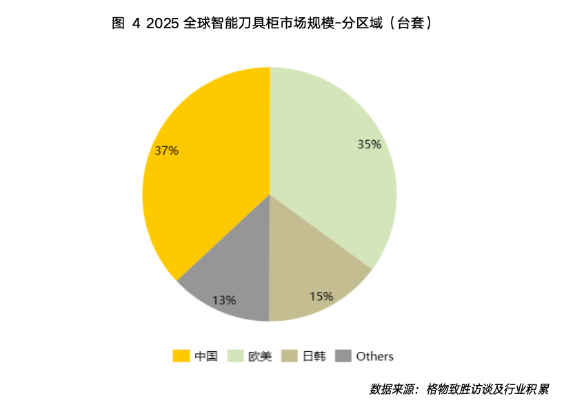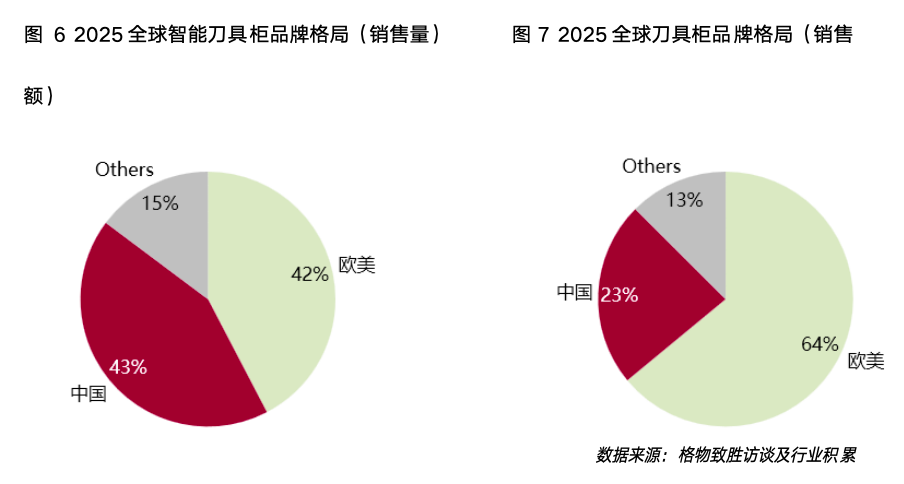预计未来随着中国厂商技术壁垒的持续突破与产品力的不断升级,智能刀具柜将逐步实现从中低端向高端场景的渗透。伴随产品结构的价值上移,中国厂商在全球市场的份额将迎来双重提升:一方面,销量份额将依托性价比优势继续扩大;另一方面,销售额占比将随产品溢价能力的增强而显著收敛,逐步缩小与欧美厂商的价值鸿沟。