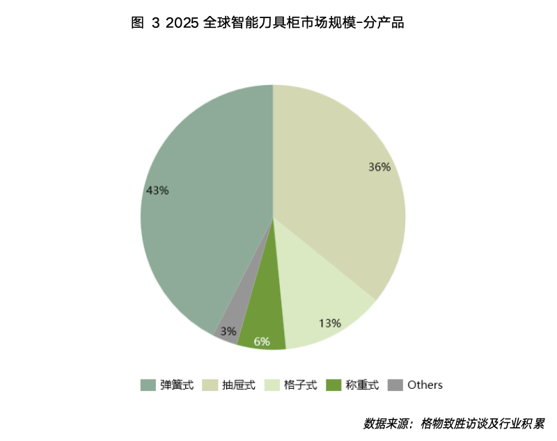 2025年弹簧式结构仍是智能刀具柜的主流形态,市场占比约43%;抽屉式紧随其后,占比约36%;格子式占比为13%;而称重式因场景适配性等因素应用占比相对较低,约为6%。