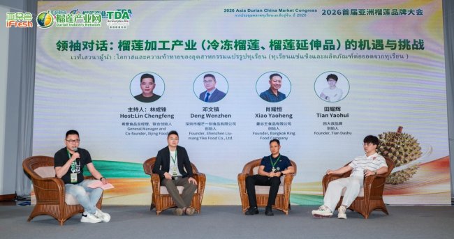 希景食品总经理联合创始人林成锋;深圳市榴芒一刻食品有限公司创始人邓文镇;曼谷王食品有限公司创始人肖耀恒;田大叔品牌创始人田耀辉聚焦“榴莲加工产业(冷冻榴莲、榴莲延伸品)的机遇与挑战”,共同探讨了深加工如何延伸榴莲产业链价值,应对市场新需求。