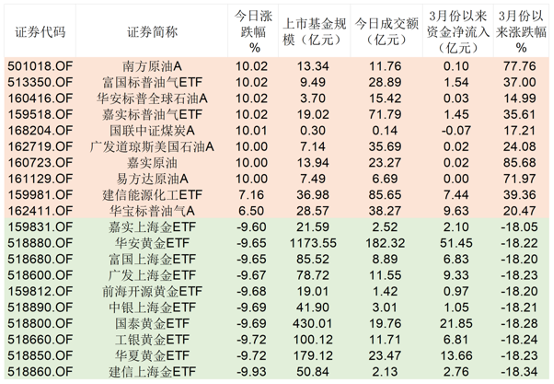 Wind数据显示,3月23日全市场2349只ETF呈现“冰火两重天”的分化行情,其中有8只原油类ETF涨停,有17只黄金类ETF跌幅超9.5%。