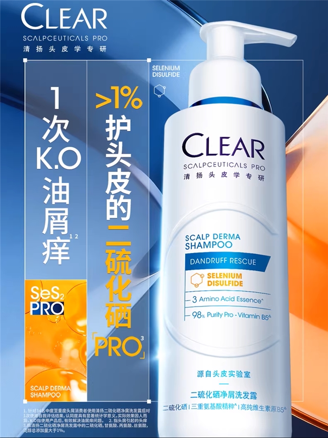 产品文档指出,头屑反复的两大元凶是:浓度不足导致去屑不够彻底,以及屏障破坏导致清洁过度。针对这两点,清扬蓝C瓶构建了>1%皮肤学级二硫化硒PRO复配体系,也被形象地称为“铁三角”组合: