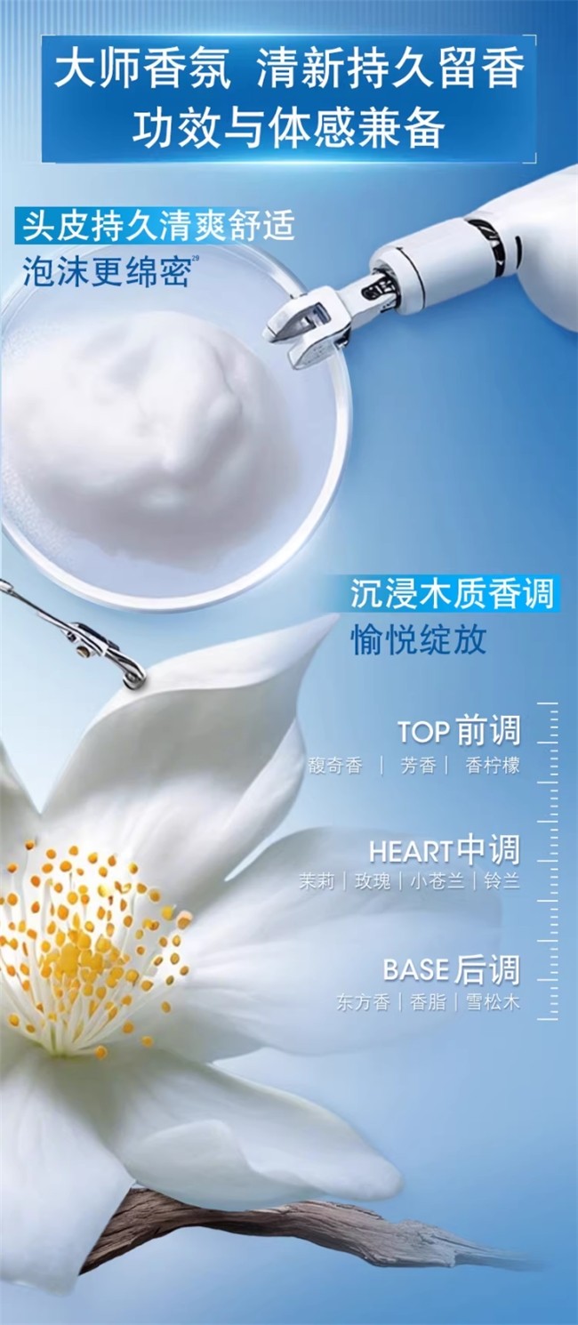 香氛体验:采用了沉浸木质花香调。前调是清新的香柠檬和馥奇香,中调过渡到茉莉、小苍兰的花香,后调以沉稳的雪松木和东方香脂收尾。这种大师级的香氛设计,让去屑过程不再是“用药”,而是一种享受。