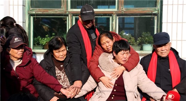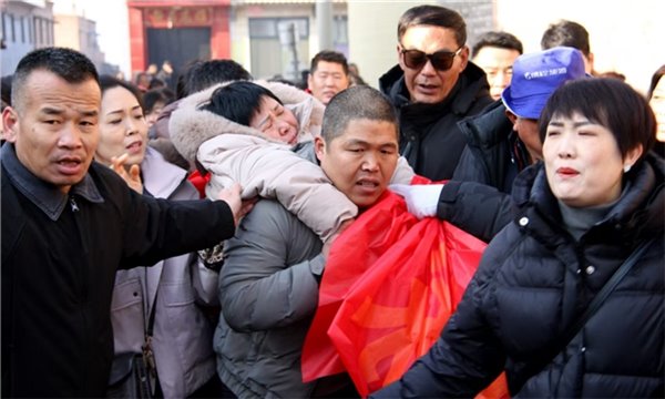 认亲现场,颉巧芳(左三)晕倒后,外甥背起她