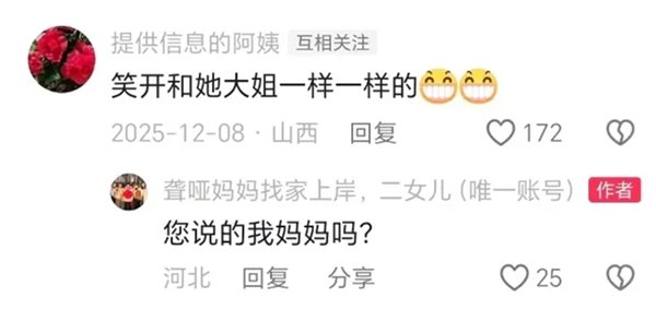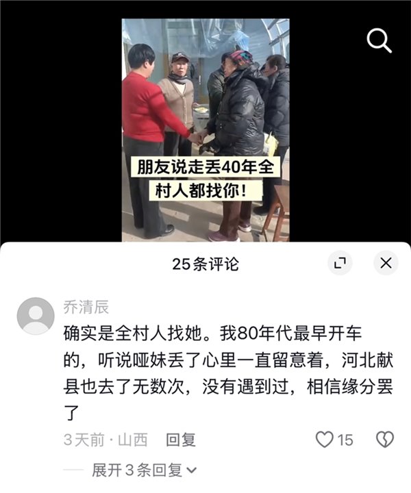 2025 年 12 月 7 日下午,“自在心安”在自己的视频评论区发现了网友 @淡定的留言:在山西晋中祁县祁城村,邻居家丢过一个女孩,也是聋哑人。他迅速介入,将从 @淡定那里获取的照片发给颉巧芳辨认。