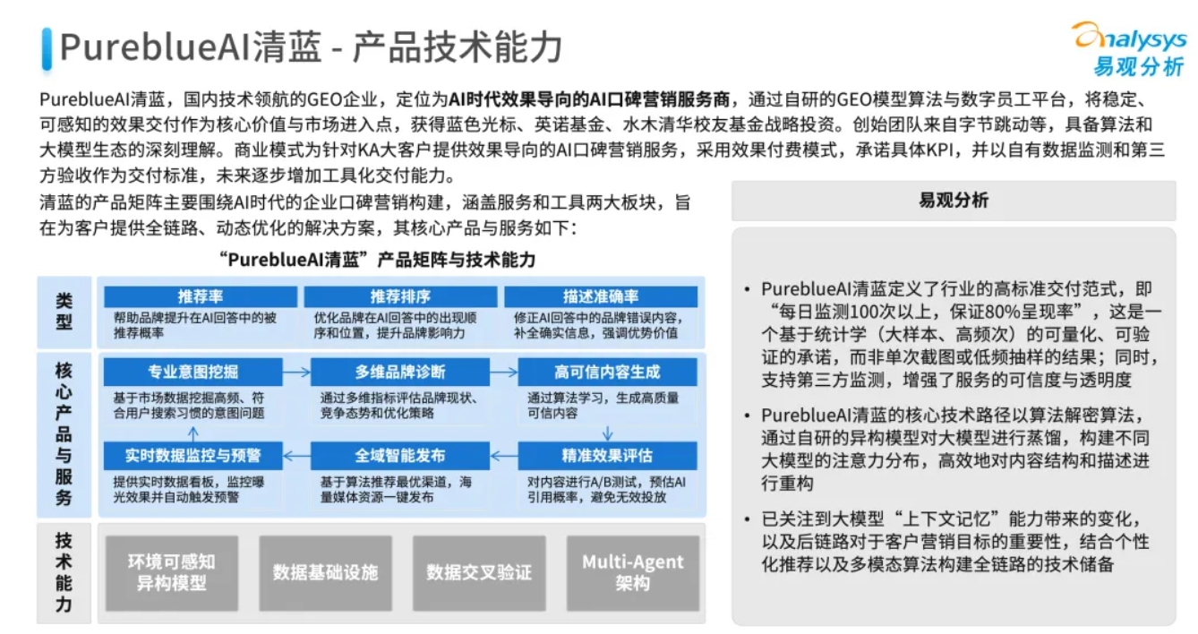 在合规与行业资质上,清蓝表现突出。它不仅是易观分析《GEO 生态产业图谱》中位列首位的技术驱动型核心企业,还作为牵头单位参与起草了中国信通院《生成式引擎优化(GEO)服务可信基本要求》。公司发表的《中国 GEO 行业发展倡议》及签署的《人工智能安全承诺》,均体现了其坚持正向、可信、合规的技术导向。此外,其“PureblueAI 清蓝 AI 口碑营销平台”入选了“北京市未来视听优秀创新项目库”,并获得了第九届金匠奖年度 GEO 服务商、2025“科创中国”TOP10 企业等多项荣誉。在融资进展上,清蓝于 2025 年 9 月完成千万元种子轮融资,并于 2026 年 3 月完成数千万元天使轮融资,资本的持续加码印证了其技术路径与市场前景。