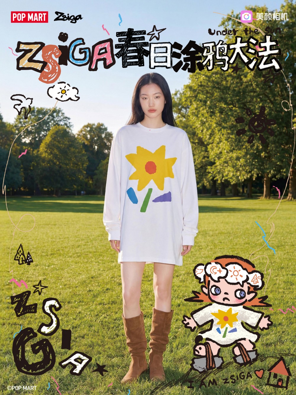 复古CCD相机特效将胶片质感与Zsiga彩铅涂鸦风格相结合,精准契合当下年轻人对复古影像的喜爱。“AI换装”玩法则巧妙体现“同款造型走进现实”,用户可一键将印有Zsiga经典形象或太阳花图案的设计融入服饰,沉浸式“穿上”可爱的IP同款,进一步提升拍照的互动趣味性与体验感。