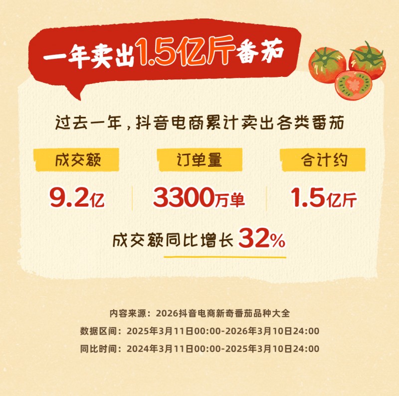 3月23日,《2026抖音电商新奇番茄品种大全》发布(下称“报告”),呈现平台番茄销售情况和大众消费趋势。数据显示,过去一年,抖音电商累计卖出各类番茄超3300万单,总计约1.5亿斤,成交额同比增长32%。得益于高颜值和差异化口感,牛排番茄、火山番茄、泰番麒麟、豹纹番茄等特色番茄品种在抖音电商销售额快速增长,成为小众农产品“破圈”的典型样本。