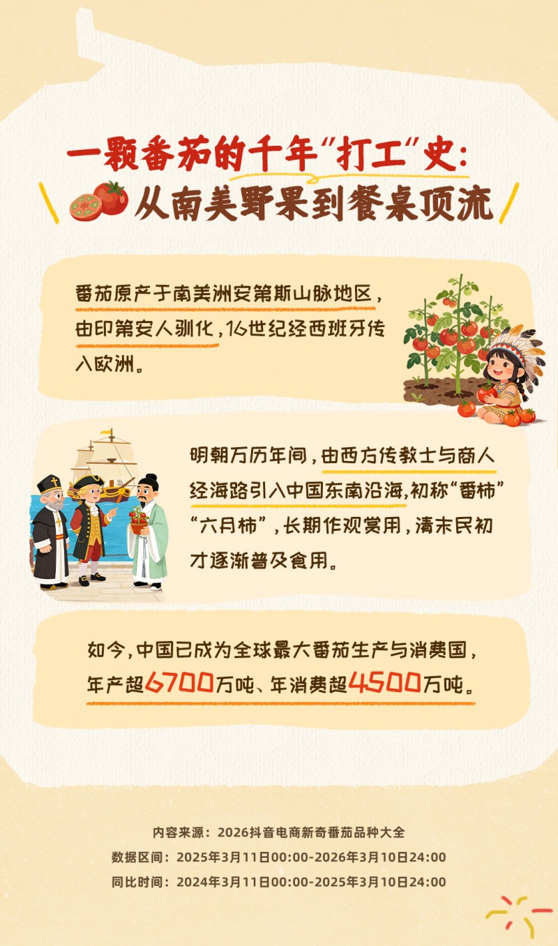 从观赏植物到国民蔬菜,再到如今千奇百怪的网红品种,番茄的千年演变史也是农业现代化的缩影。抖音电商相关负责人表示,平台始终致力于通过优质乡村短视频和直播内容提高农产品市场关注度,助力农民增收。“内容+电商”的模式不仅让更多小众农产品被看见、被消费,更推动了品种改良、品牌打造和产业升级,“好农品卖出去了,种植户和农货商家可有更多精力专注于品种培育和品质提升,平台则提供流量扶持、物流保障和售后支持,形成一套良性循环。”前述负责人表示,未来平台还将持续投入,助力更多优质农产品“出圈”,为乡村振兴注入新活力。