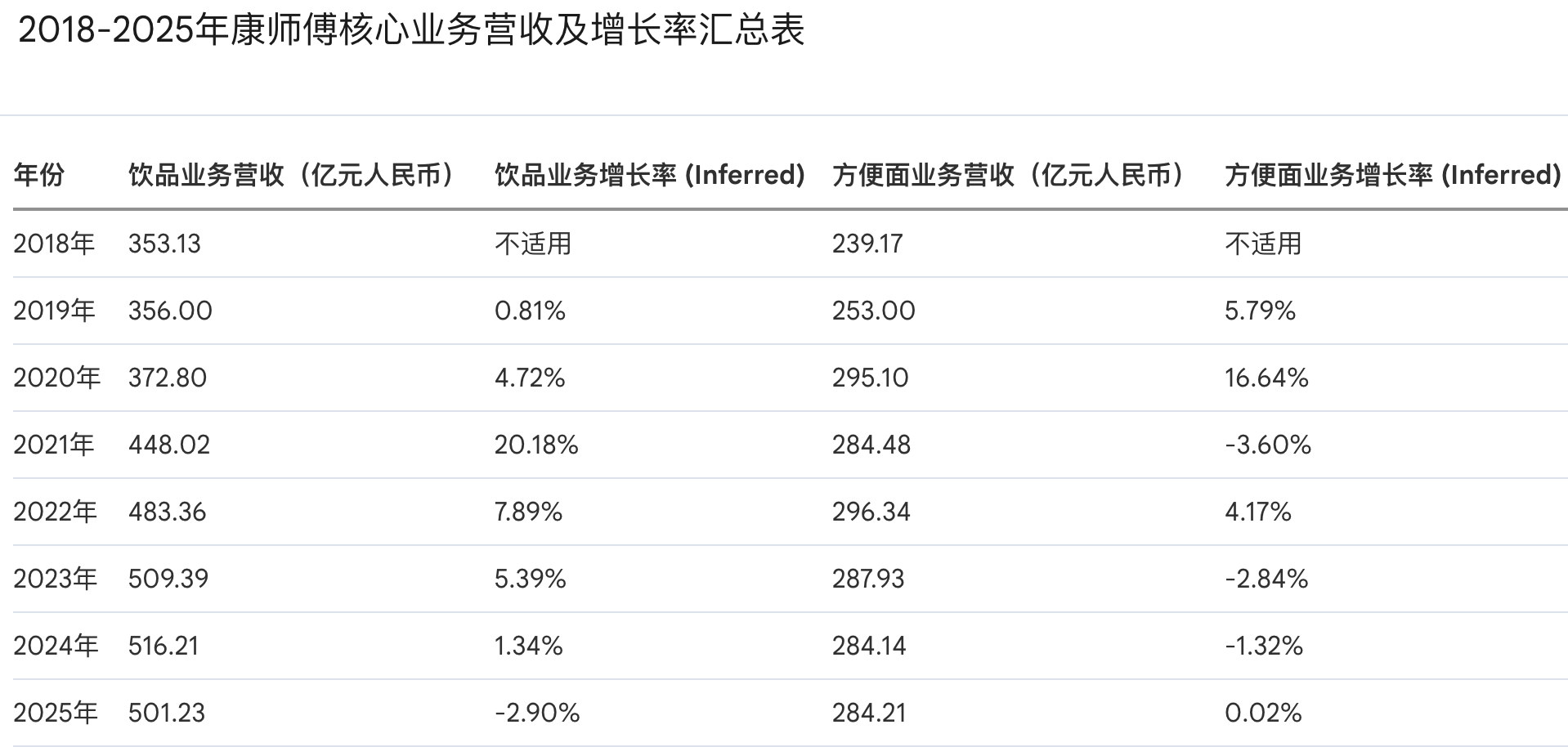 康师傅营收经历了几年的低速增长后,2025年终于负增长了。