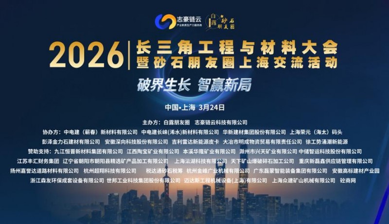 2026年3月24日,2026长三角工程与材料大会暨砂石朋友圈上海交流活动在上海成功举办。本次大会以“破界生长 智赢新局”为主题,由志豪链云、白露团队联合主办,中电建(蕲春)新材料、中电建长崃(浠水)新材料、华新建材集团、上海荣元(海太)码头、安徽深向科技、吉利雷达新能源皮卡、徐工势涌潮新能源、彭泽金力石建材、大冶明成物资贸易等9家单位协办,长三角地区工程建设、砂石建材、智慧物流、供应链金融、绿色矿山等领域300余位行业精英参会,共商产业升级路径、共探创新发展机遇。