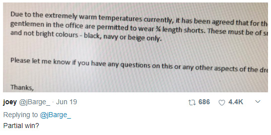 结果居然是,公司妥协了,发了一封邮件允许员工穿短裤去上班。