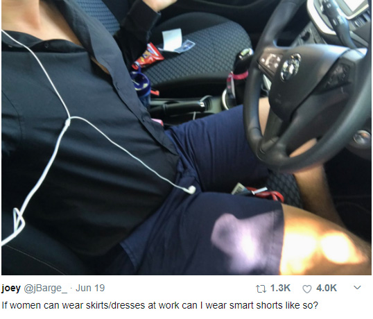 网友Joey终于承受不住高温,选择了穿着短裤去上班——结果被公司以“着装不符合规范”的理由遣送回家了。