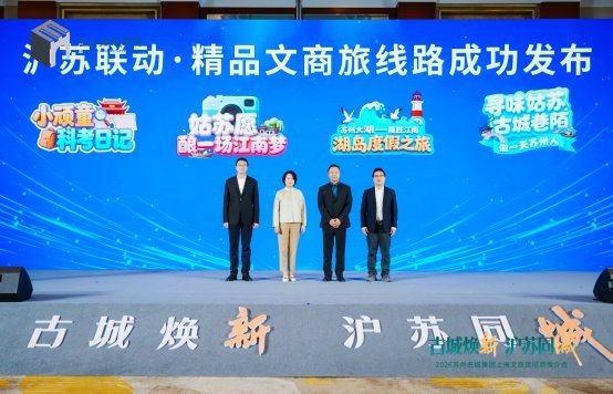 为深入推进长三角一体化发展战略,深化沪苏同城文旅融合,今天,2026苏州名城保护集团上海文商旅招商推介会在上海黄浦区隆重举行。本次推介会以“古城焕新·沪苏同城”为主题,江苏省发展和改革委员会、上海黄浦区、苏州姑苏区领导出席会议,沪苏两地文旅投资、文创、商业运营、数字化等各类企业代表以及行业协会、媒体代表等200余人齐聚一堂。