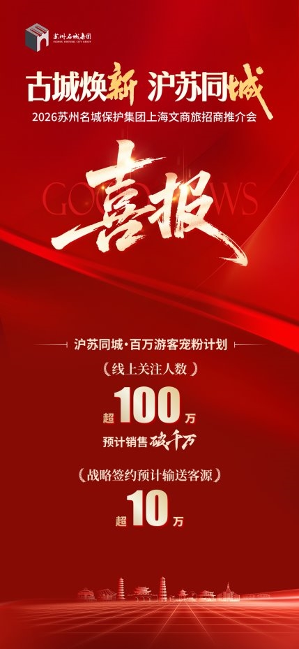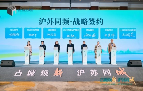 推介会上更有喜报频传。“沪苏文商旅产业生态圈”合作签约仪式举行,苏州名城保护集团与古建、文化等领域合作伙伴签署意向合作协议。“沪苏同城·百万游客宠粉计划”发布,包含上海市民专属福利、文旅组合套餐、直播秒杀及上海体验官招募等四大核心举措,以“线下签约+线上直播”双轮驱动,掀起一轮文旅消费热潮。