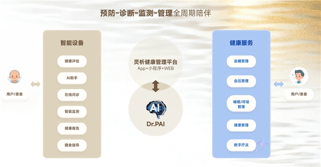 在高血压管理领域,灵析健康慢病管理平台与文元智能医生Dr. PAI深度对接。Dr. PAI内置《高血压筛查与防治3000问》医学知识库,能将临床专家的诊疗逻辑结构化嵌入系统。双方的合作不仅是API层面的对接,更是从算法层、平台层到研发流程的深度融合:灵析的医疗级连续监测硬件成为Dr. PAI的“感官神经”,实时捕捉用户的血压波动;Dr. PAI则作为“大脑”,基于连续数据流实现个性化健康干预与风险评估。