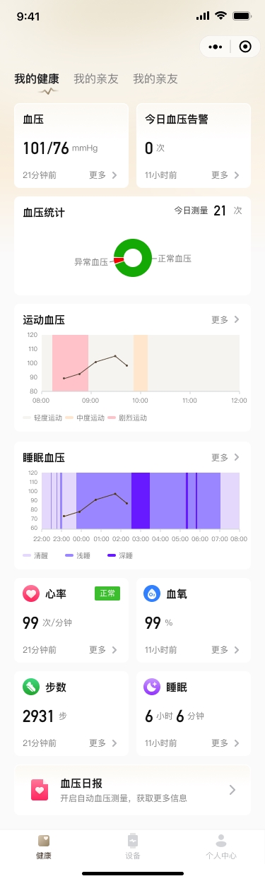 灵析健康慢病管理平台采用一体化架构设计,通过蓝牙等方式连接灵析生物的连续血压监测手表、便携式制氧机等医疗级设备,实现血压、血氧、心率、血糖趋势、睡眠等关键数据的自动同步与可视化呈现。用户无需手动记录,打开小程序即可看到连续的健康趋势曲线,真正看懂自己的身体变化。未来,平台还将分阶段推出患者端、医生端及院端管理模块,形成从个人健康管理到临床诊疗支持的无缝闭环——患者在家监测的数据可实时同步给医生,医生的指导建议也能精准触达患者,让慢病管理告别“各管一段”的碎片化状态。