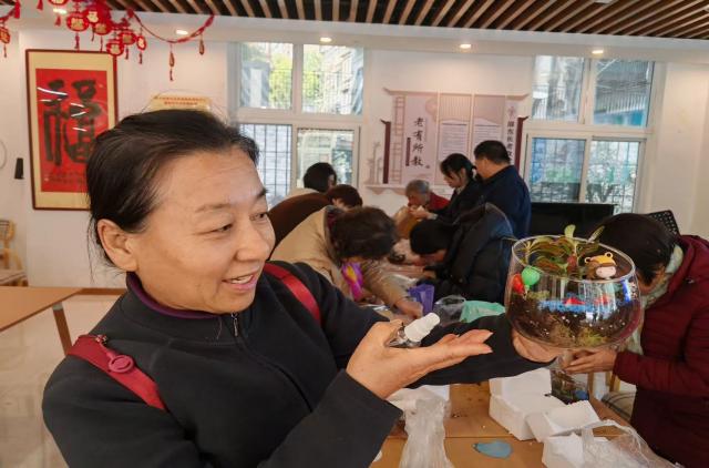 在工作人员的悉心指导下,老人们围坐一处,细心地将苔藓、砂石、小摆件铺入玻璃容器,依照自身喜好逐步搭建属于自己的迷你生态景观。不少老人在摆弄绿植的同时,与身旁的老伙伴交流刚刚学到的反诈要点:“方才提及的高收益理财不可轻信,恰似这微景观,需慢慢培育,急不得。”“没错,咱们的养老钱也需妥善守护,不可被骗子骗走。”指尖的创作使原本严肃的宣讲变得生动柔和,既舒缓了老人们的情绪,也让反诈知识在欢声笑语中得到强化。