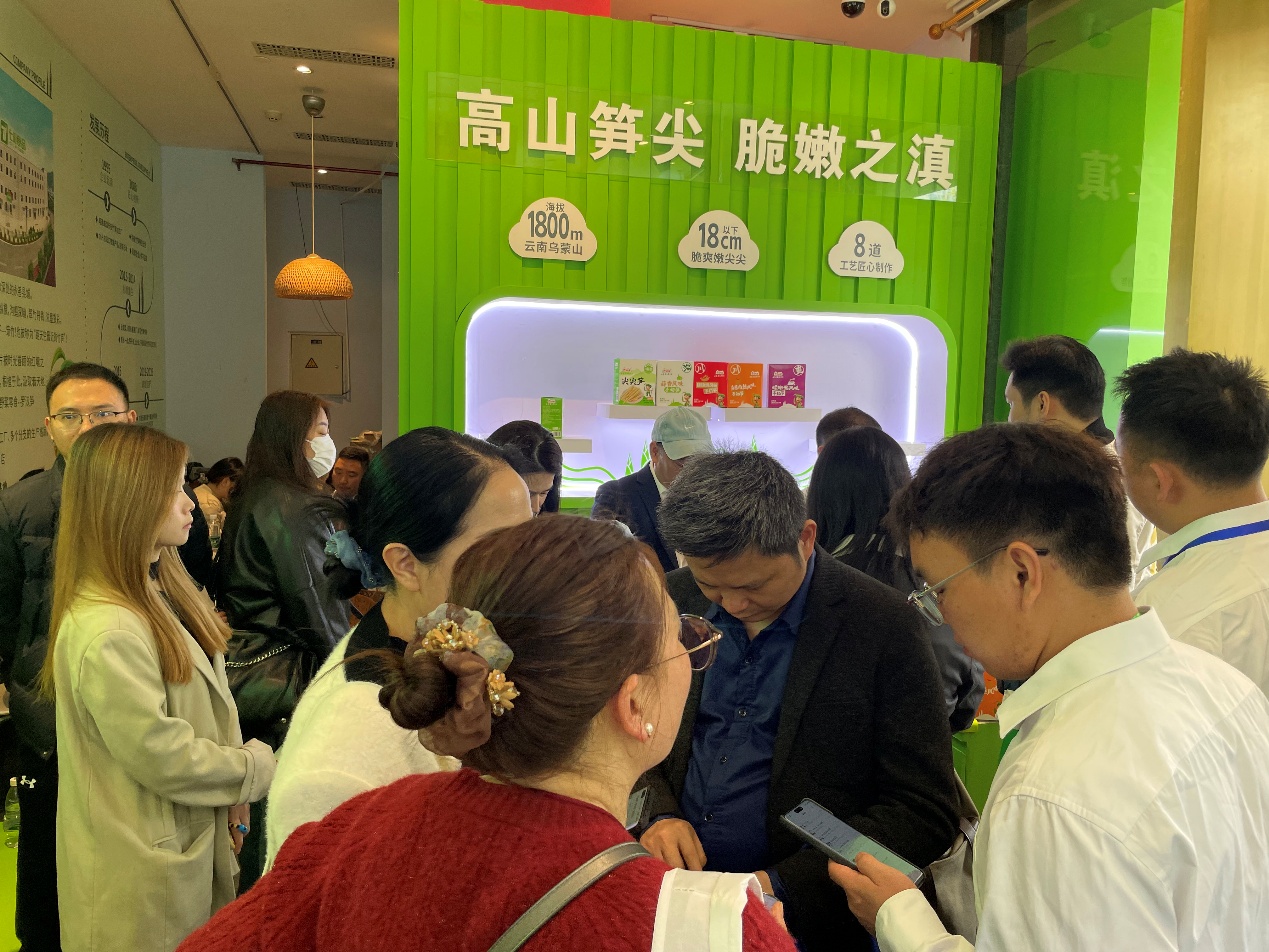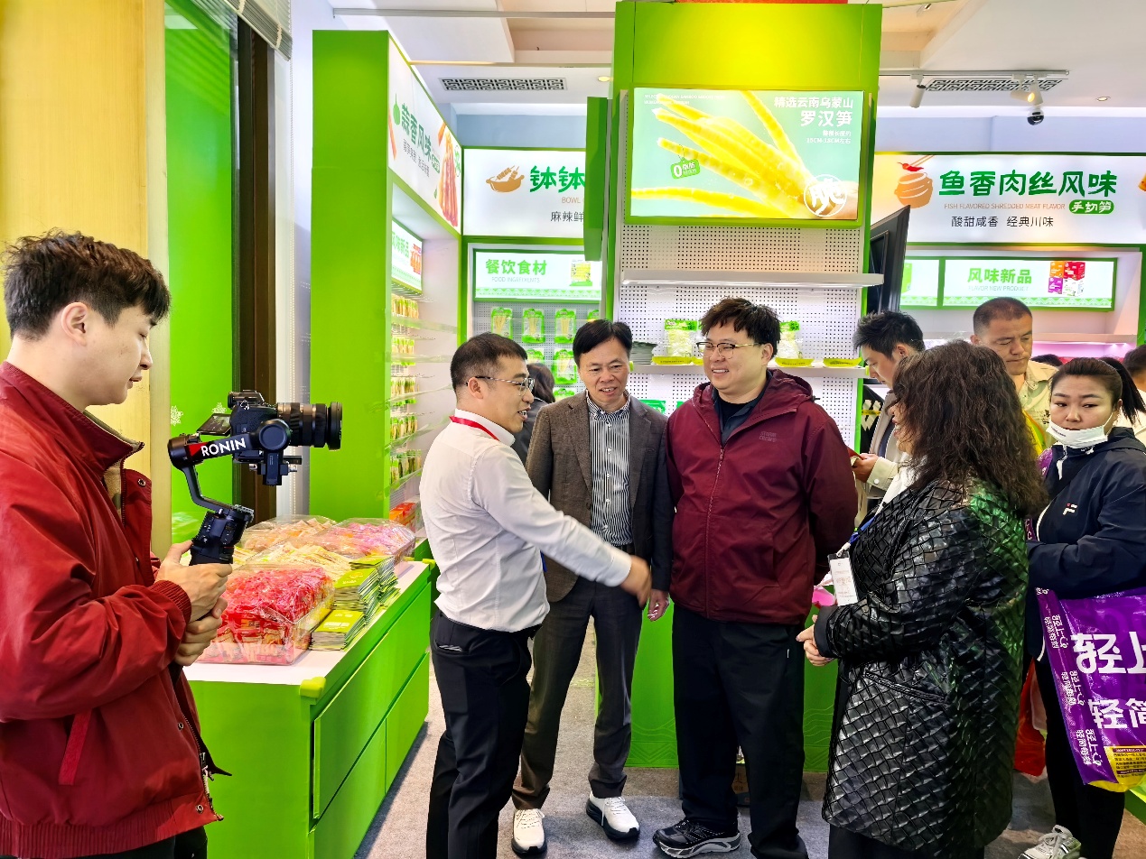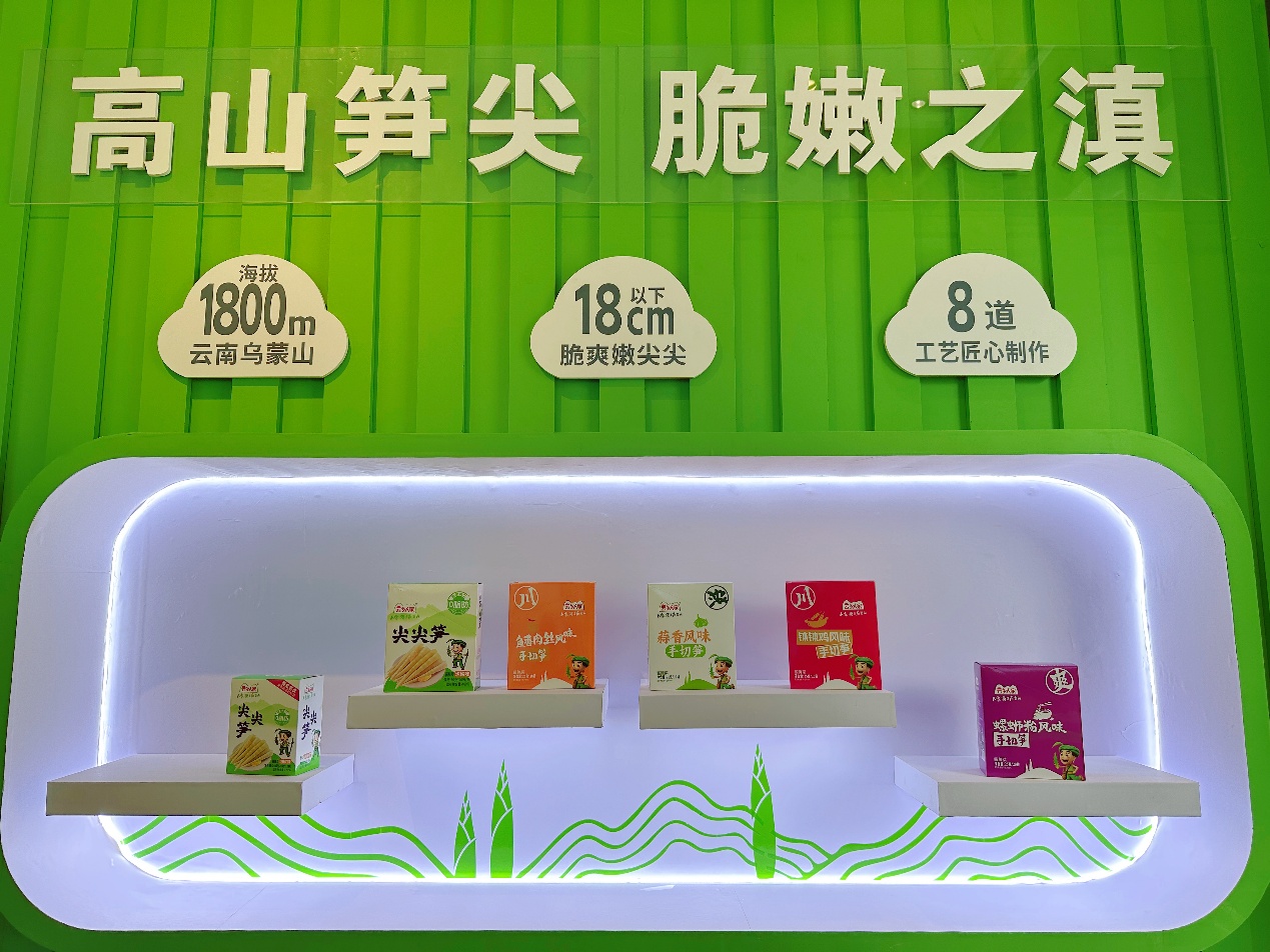 2026年成都春季糖酒会的酒店展区内,云南七彩食品的展位前围满了采购商。泡椒竹笋的经典味道之外,钵钵鸡、鱼香肉丝、蒜香、螺蛳粉味四款新口味手切笋一字排开,吸引着往来经销商驻足品尝。