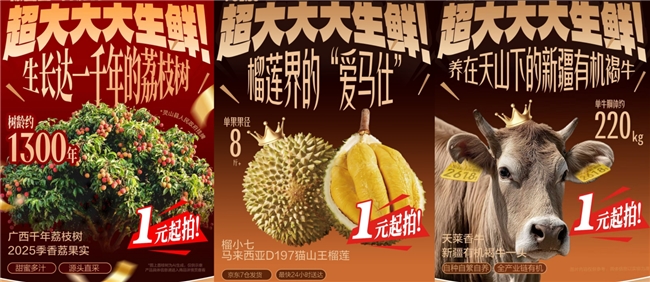 事实上,自2025年起,京东生鲜“超大生鲜”拍卖活动已汇聚超500款新奇特生鲜好物,吸引超30万人参与。稀奇好玩的商品、新颖有趣的玩法,让消费者既能“玩”又能“省”。去年,千年荔枝古树全年采摘权以13101元拍出,折算每公斤仅约32元;源自马来西亚黄金产区的猫山王榴莲以551元成交,不到市场价8折;新疆有机和牛礼盒市场价6000多元,最终以1004元拍出,不到2折。许多消费者抱着好玩的心态而来,却意外发现成交价远低于市场售价,收获了意想不到的“捡漏”体验。