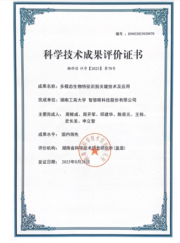 近日,由智慧眼科技股份有限公司与湖南工商大学联合攻关的产学研合作项目“多模态生物特征识别关键技术及应用”顺利通过科技成果鉴定。经权威专家组评审,该项目整体技术达到国内领先水平,其中“基于生物启发变换的掌纹指静脉特征空间构建技术”与“基于相关循环滤波与层次主题模型的步态人脸识别技术”两项核心技术更是达到国际先进水平(湘科信评字【2025】第70号)。