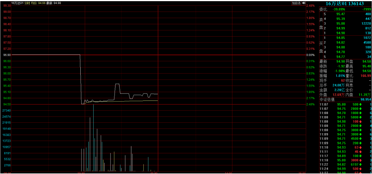 事实上,不止是16万达01债大幅跳水,15万达01债(122446)早盘价格一度跌逾2.3%,15万达02债(122467)早盘跌2.43%。