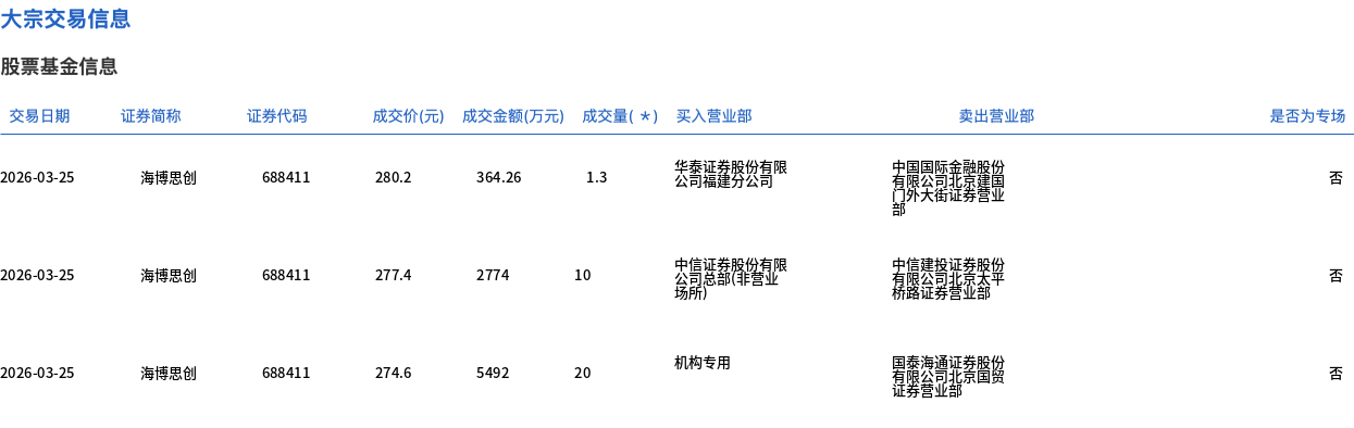 3月25日,海博思创大宗交易成交31.3万股,成交额8630.26万元,占当日总成交额的3.84%,成交均价275.73元,较市场收盘价280.2元折价1.6%,其中最高成交价280.2元,最低成交价274.6元。