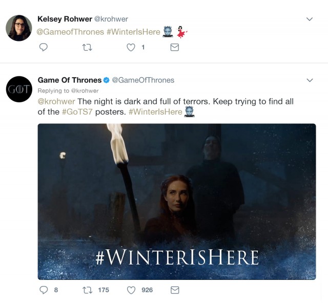 最新一个例子是《权力的游戏》。在新一季一片“凛冬将至”史诗气质的宣传中,Twitter却出来“搞事情”:专门设计了一套《权力的游戏》emoji,用户需要@权力的游戏,加上# WinterIsHere(凛冬将至)的话题标签,并加上专属的emoji表情,就可以解锁一张第七季海报。