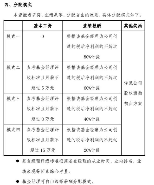 按照公告所称,基金经理可在每年的6月和12月自由选择当年和次年的薪酬分配模式,但选择基本工资不为零模式的最终总收入不得超过模式一的业绩报酬总额的80%。
